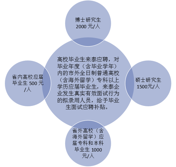 | 大专生、本科生来泰实习 | / | (2021.07.01)1500元/月,补贴3个月 | 应届大专毕业生,外地来泰或泰州市跨市(区): 500元/月,不超过3年 |